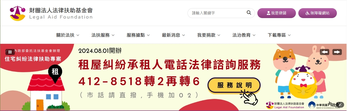 內政部為讓租屋民眾在面臨租屋糾紛時能獲得正確法律知識,自113年8月起已與法律扶助基金會合作推動「住宅租賃糾紛電話法律諮詢服務」,提供專線 412-8518(手機撥打請加 02,接通後轉 2 再轉 6),由專業律師即時提供意見。
